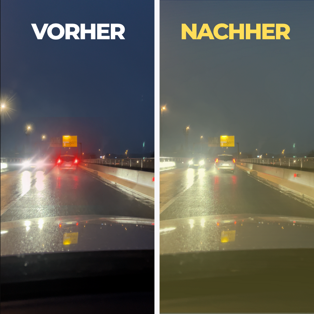 Bei Nachtfahrten müssen sich deine Augen ständig zwischen dunkler Umgebung und hellen Lichtquellen umstellen. Das führt schnell zu brennenden, trockenen Augen, Spannungsgefühl um Augen und Stirn und schnellerer Ermüdung. NachtBlick Pro hilft, den Helligkeitsunterschied subjektiv zu glätten. Das Licht wirkt weniger aggressiv, deine Augen müssen nicht bei jedem entgegenkommenden Fahrzeug kämpfen.